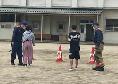 大きな地震が発生した後、給食室から出火したとの想定で、全児童が運動場に避難しました。