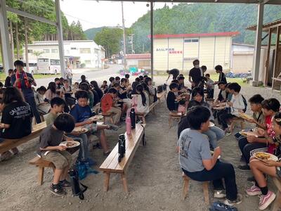 陶芸体験が終わり、登り窯の見学後にお弁当の昼食を食べています。