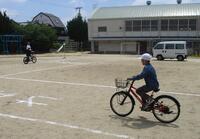 自転車に乗る前の点検の仕方や実施に運動場に作ったコースを一周して、自転車に乗る際の注意点を教えていただきました。