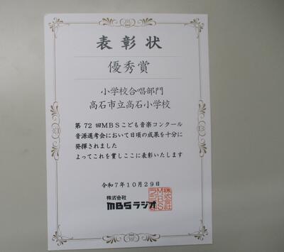 第72回MBSこども音楽コンクール音源選考会において、高石小学校6年生の合唱が、見事「優秀賞」を獲得しました。6年生の皆さんおめでとうございます。